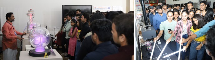 | 45 students and 3 faculty of 5th and 7th Sem B.Tech. (Information Technology) of Atmiya University, Rajkot visited IPR on 29th August 2025. The visitors were introducted to Basics of Plasma, Tokamak and other applications by Mr. Gattu Ramesh Babu. Later, they were demonstrated plasma based exhibits at Outreach hall by ORD members. The visitors were briefed about tokamaks at Science Park and SST1 hall. |