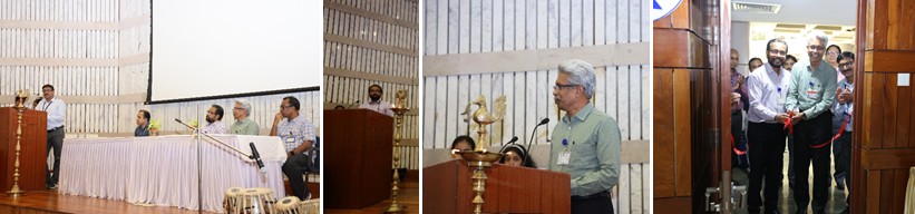a) Dr. Paritosh Chaudhuri introduced the dignitaries to the audience b) Shri. K. Jayakumar delivering the inaugural speech c) Dr. G. Suigilal presided over the inauguration and d) Ribbon cutting of Plasma exhibition by the guests of the event